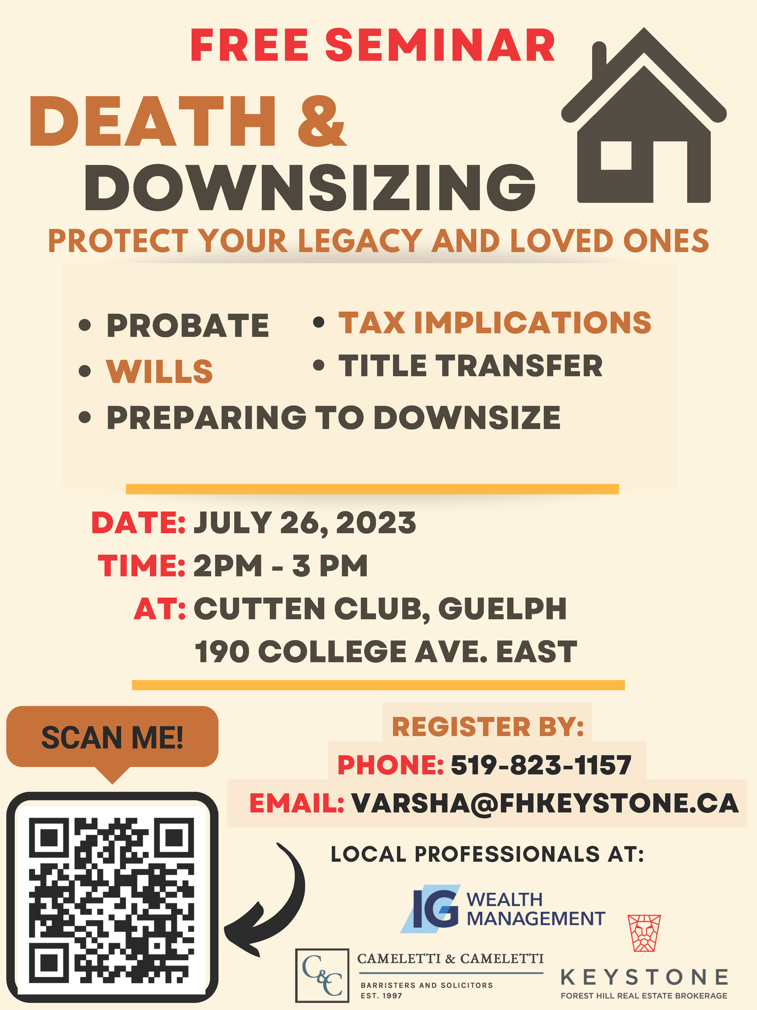 Our next community seminar, will be on Wills, Powers of Attorney and Title Transfers with Realtor Varsha Pasel and Certified Financial Planner Brandon Yanchus on July 24, 2023 at 2pm at the Cutten Club in Guelph, Ontario.
